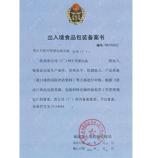 出入(rù)境食品包裝備(bèi)案書