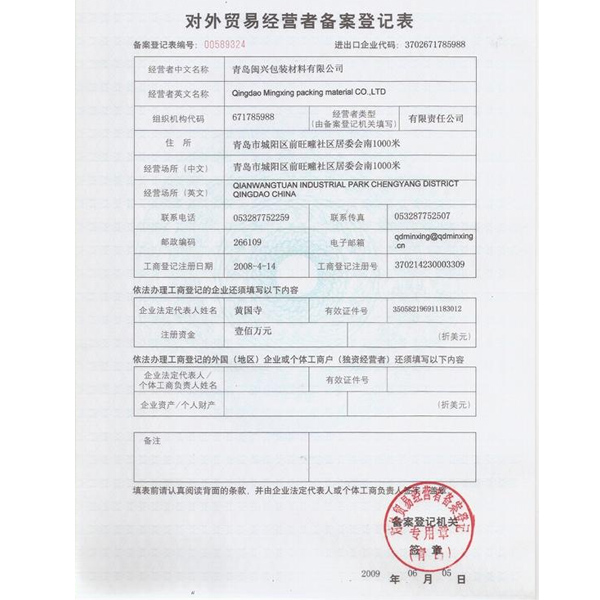 青島對外(wai)貿易經營者備(bèi)案登記表
